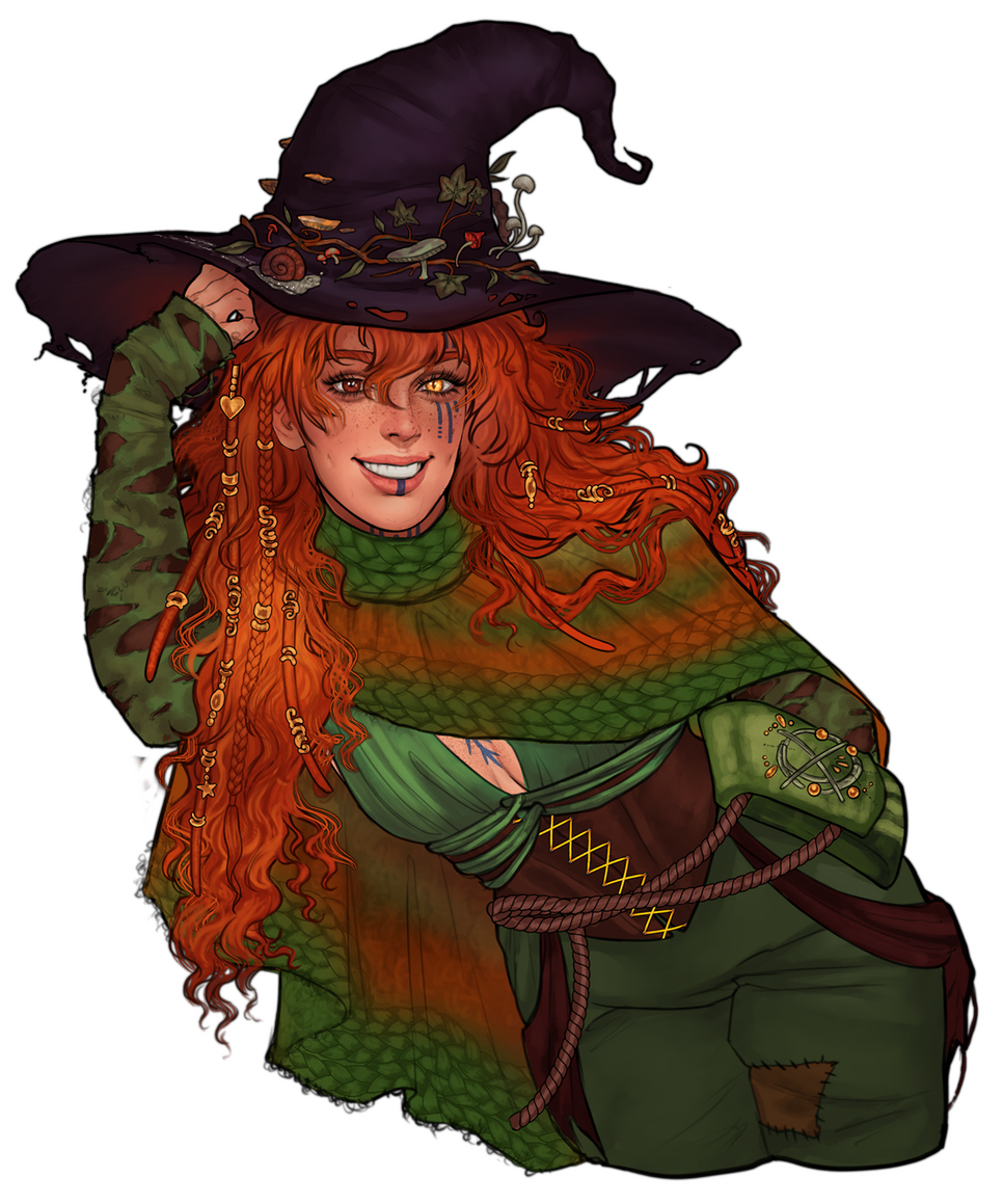 A living contradiction of bloom and decay, Willow drifts through the world like a secret spoken by the forest itself. Cascades of ember-bright, dreaded ginger hair tumble to her waist - Each lock braided with crow feathers, river-glass beads, and scavenged trinkets whose stories only she recalls. One eye gleams a luminous, feral gold; the other is a void-black mirror, as deep and silent as loam beneath the roots. To meet that mismatched gaze is to feel as though the woods are weighing your soul - Then laughing, softly, at your unease.Her garb is an ever-growing patchwork - Sun-bleached hemp stitched to brocade, old sail-cloth married to moss-dyed wool, held together by bright, mismatched thread. Vivid beads and tiny bones jingle at every stride, while sudden flares of sunset orange or spring bud green break the earthy palette. Over all, a poncho-cloak of woven vine, bark-fibre, and fraying silks drapes her shoulders; it rustles with hidden life, breathing with every breeze. From its fringes sprout colonies of pale mushrooms and emerald moss, thriving as though she were fertile soil made flesh.An intoxicating miasma follows wherever she wanders - Damp moss, crushed wildflower, warm rot, and the faint spark of ozone after summer rain. It is the scent of a forest caught between life and compost, birth and dissolution, the moment green becomes gold. In that aroma, in those mismatched eyes, in the quiet certainty of her stride, Willow remains an enigma: wild yet gentle, decaying yet vibrant, a keeper of secrets who speaks in spores and silence.