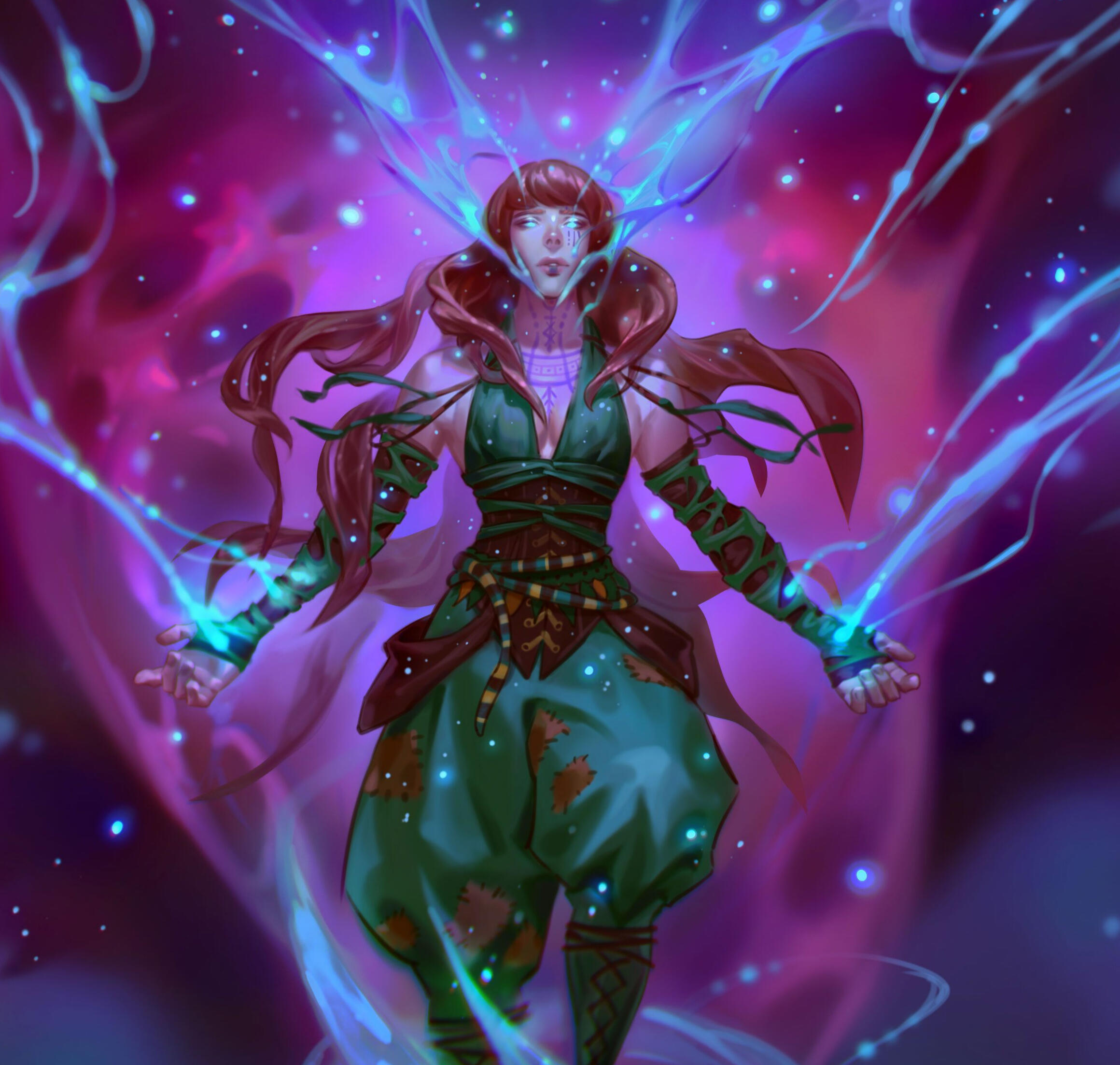 A living contradiction of bloom and decay, Willow drifts through the world like a secret spoken by the forest itself. Cascades of ember-bright, dreaded ginger hair tumble to her waist - Each lock braided with crow feathers, river-glass beads, and scavenged trinkets whose stories only she recalls. One eye gleams a luminous, feral gold; the other is a void-black mirror, as deep and silent as loam beneath the roots. To meet that mismatched gaze is to feel as though the woods are weighing your soul - Then laughing, softly, at your unease.Her garb is an ever-growing patchwork - Sun-bleached hemp stitched to brocade, old sail-cloth married to moss-dyed wool, held together by bright, mismatched thread. Vivid beads and tiny bones jingle at every stride, while sudden flares of sunset orange or spring bud green break the earthy palette. Over all, a poncho-cloak of woven vine, bark-fibre, and fraying silks drapes her shoulders; it rustles with hidden life, breathing with every breeze. From its fringes sprout colonies of pale mushrooms and emerald moss, thriving as though she were fertile soil made flesh.An intoxicating miasma follows wherever she wanders - Damp moss, crushed wildflower, warm rot, and the faint spark of ozone after summer rain. It is the scent of a forest caught between life and compost, birth and dissolution, the moment green becomes gold. In that aroma, in those mismatched eyes, in the quiet certainty of her stride, Willow remains an enigma: wild yet gentle, decaying yet vibrant, a keeper of secrets who speaks in spores and silence.